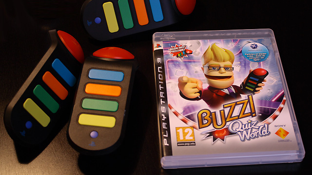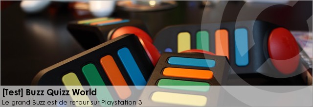 Buzz Quiz World est le dernier opus en date de la série "Buzz" développée par différents studios anglais de Sony Europe. Si tous les tests semblent s'accorder sur l'absence de nouveautés d'un point de vue gameplay sur cette version, n'ayant jamais joué à Buzz auparavant je suis plutôt satisfait du titre. Les questions sont très variées (5000 nouvelles questions) et de nombreux quiz créés par les utilisateurs sont disponibles en ligne. Vous pouvez d'ailleurs vous y essayer ou créer les votres sur le site officiel du jeu : mybuzzquiz.com .