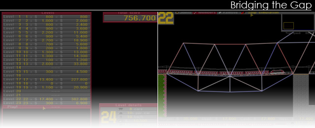 Bridging the gap vous place dans la peau d'un architecte chargé de la constructions de ponts ferrovières tous plus complexes les uns que les autres. Vous disposez pour chaque challenge d'un budget donné, de quelques points d'ancrage sur lesquels reposer votre structures, et d'informations sur le convoi qui va passer.