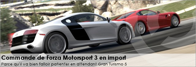 C'est un véritable cadeau qu'a fait Sony à Microsoft et Turn10 en repoussant la sortie de Gran Turismo 5. Comme prévu les joueurs du simulateur nippon sont fortement tentés de retourner leur veste, au moins le temps de patienter jusqu'à la date de sortie (japonaise pour l'instant) de mars 2010. J'ai donc craqué pour un exemplaire de Forza Motorsport 3. Pas d'édition collector ni de volant hors de prix, mais une édition normale en import pour limiter les frais.