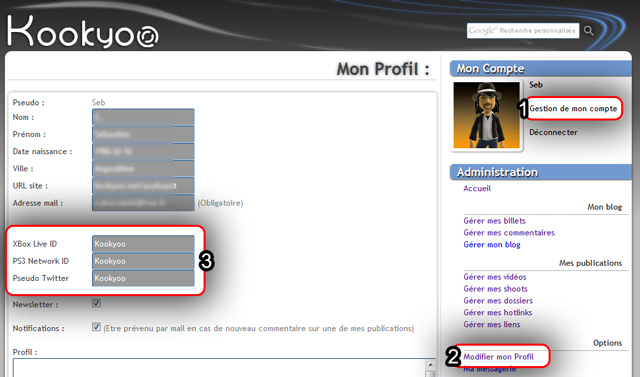 Pour ajouter vos information il vous faut d'abord vous connecter avec votre compte sur le site (ou en créer un si ce n'est pas déjà fait), rendez-vous dans la partie "Gestion de mon compte" (1) > "Modifier mon Profil" (2) et renseignez simplement les champs correspondants (3). Pour supprimer les informations laissez simplement le champ vide.