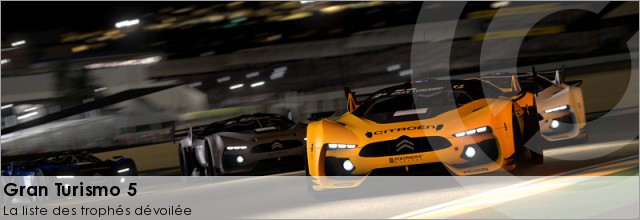 Alors que Gran Turismo 6 est déjà en préparation et que nous sommes toujours sans date de sortie pour Gran Turismo 5 (entre le 3 et le 8 décembre selon certains sites de vente, le 30 novembre sur le Sony Style), une vidéo du jeu final mise en ligne sur Youtube par une personne ayant le jeu en main permet aujourd'hui de connaître la liste des trophées (et donc avoir une petite idée sur le contenu) qui seront disponibles dans le jeu. Pas moins de 60 trophées sont au programme :