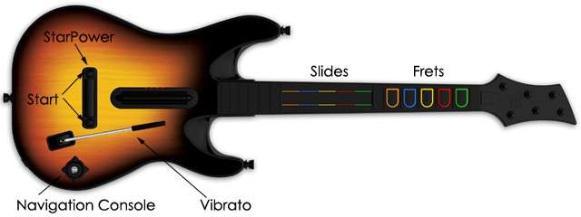 Le nouveau modèle fabriqué par RedOctane représente à lui seul la tendance beaucoup plus sérieuse de cet opus. On perd un peu le côté "jouet" pour se retrouver avec un instrument plus grand, plus imposant. La barre de médiator est plus en avant sur la guitare, très pratique à l'usage, et surtout plus grande. Les frets sont identiques mais le manche paraît plus court, par contre de nouvelles touches tactiles - les slides - font leur apparition sur le bas du manche. A l'usage elles ne se révèlent pas vraiment très utiles, mais la pratique assidue devrait pouvoir corriger ce problème.