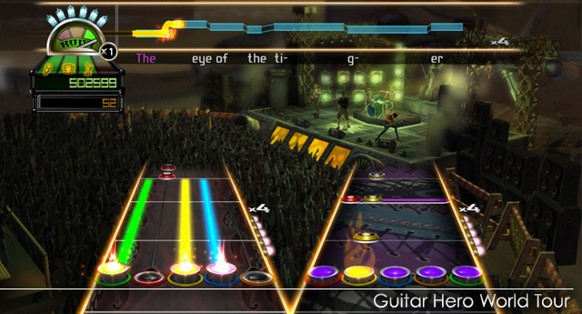 C'est avant tout un jeu musical dans lequel il faut interpréter un instrument - à la base seulement la guitare - en jouant les bonnes frets - les notes - au bon moment. Pour chaque niveau de difficulté Guitar Hero World Tour propose 5 niveaux de difficulté allant de novice à expert. Plus le niveau augmente et plus la partition se complique pour se rapprocher de la vraie tablature du morceau.