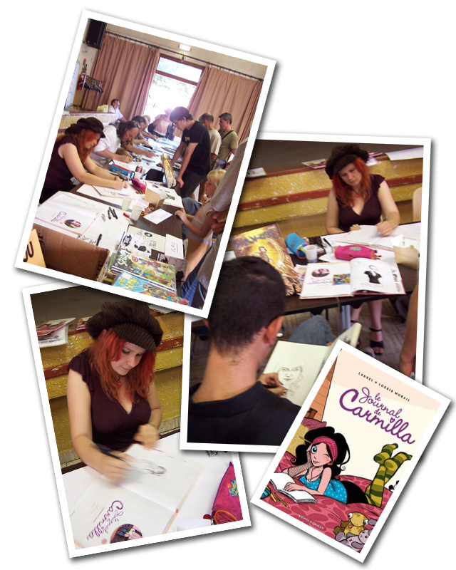 Sinon entre deux journées de vendanges nous avons eu la chance de rencontrer hier avec l'ami Maxi et lodie, la dessinatrice de BD Laurel. Elle nous a fait l'honneur de quelques dédicaces lors de la bourse d'échange de BD de Bouleternère à côté de Perpignan. Une rencontre sympatique qui prouve à quel point on peut se sentir bête lorsque l'on rencontre une personnalité connue, qui nous semble si familière à force de suivre les tribulations de son non moins célèbre blog. Difficile de trouver les mots, et on garde toujours le regret de ne pas avoir osé lui dire tout le bien qu'on pense de son travail, et posé quelques petites questions ...