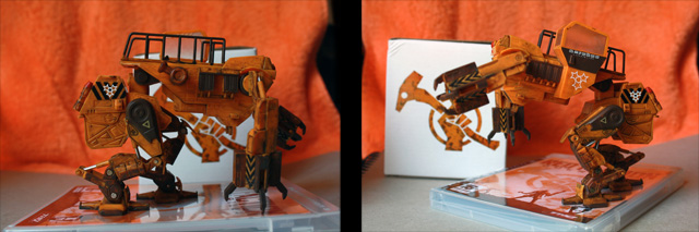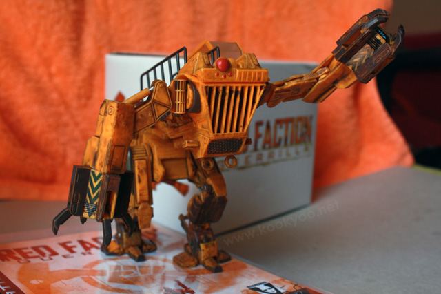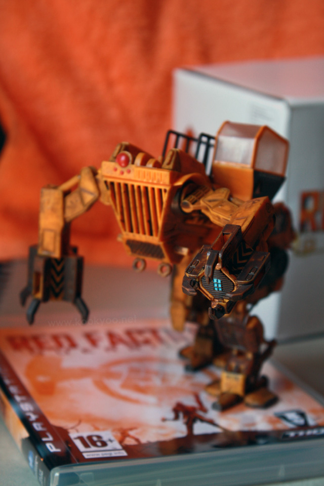 Ce matin ma nuit a été écourtée par la sonette du facteur. Heureusement le paquet que je n'attendais pas si tôt contenait l'édition Playstation 3 de Red Faction Guerilla. Le jeu était accompagné d'une petite boîte dans laquelle se trouvait une figurine représentant un Walker, ces grands robots de minage présents dans le jeu.