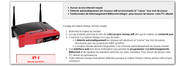 Aujourd'hui un site internet vous propose le tout premier appareil spécifiquement développé pour HADOPI : un routeur intelligent. Jugez pas vous même, pour 49¤ ce magnifique routeur wifi vous permettra de profiter librement des connexions internet de vos voisins, du p2p et vous assurera donc une totale sécurité contre les vilains courriers qui menancent votre boîte au lettre.