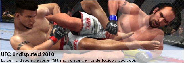 Avis aux joueurs Playstation, à compter de cette semaine, la mise à jour hebdomadaire du Playstation Store ne se fait plus le jeudi, mais le mercredi. Aussi si vous avez fait un petit tour sur votre console hier vous avez du remarquer parmi les démos la présence d'UFC Undisputed 2010.